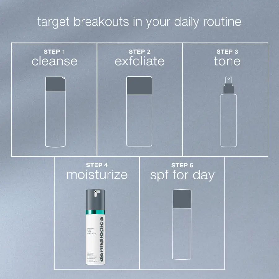 Breakouts in adults are often difficult to treat because the skin's microbiome changes as we age. Aggressive treatments can disrupt the balance, worsen breakouts, and even exacerbate signs of skin aging. Selectively targeting bacteria that cause breakouts is essential for a healthy microbiome and clear skin in adults.Dermalogica's Breakout Biotic Moisturizer targets breakouts to reduce existing blemishes and help prevent new ones. This gel moisturizer hydrates + supports the skin's microbiome.
