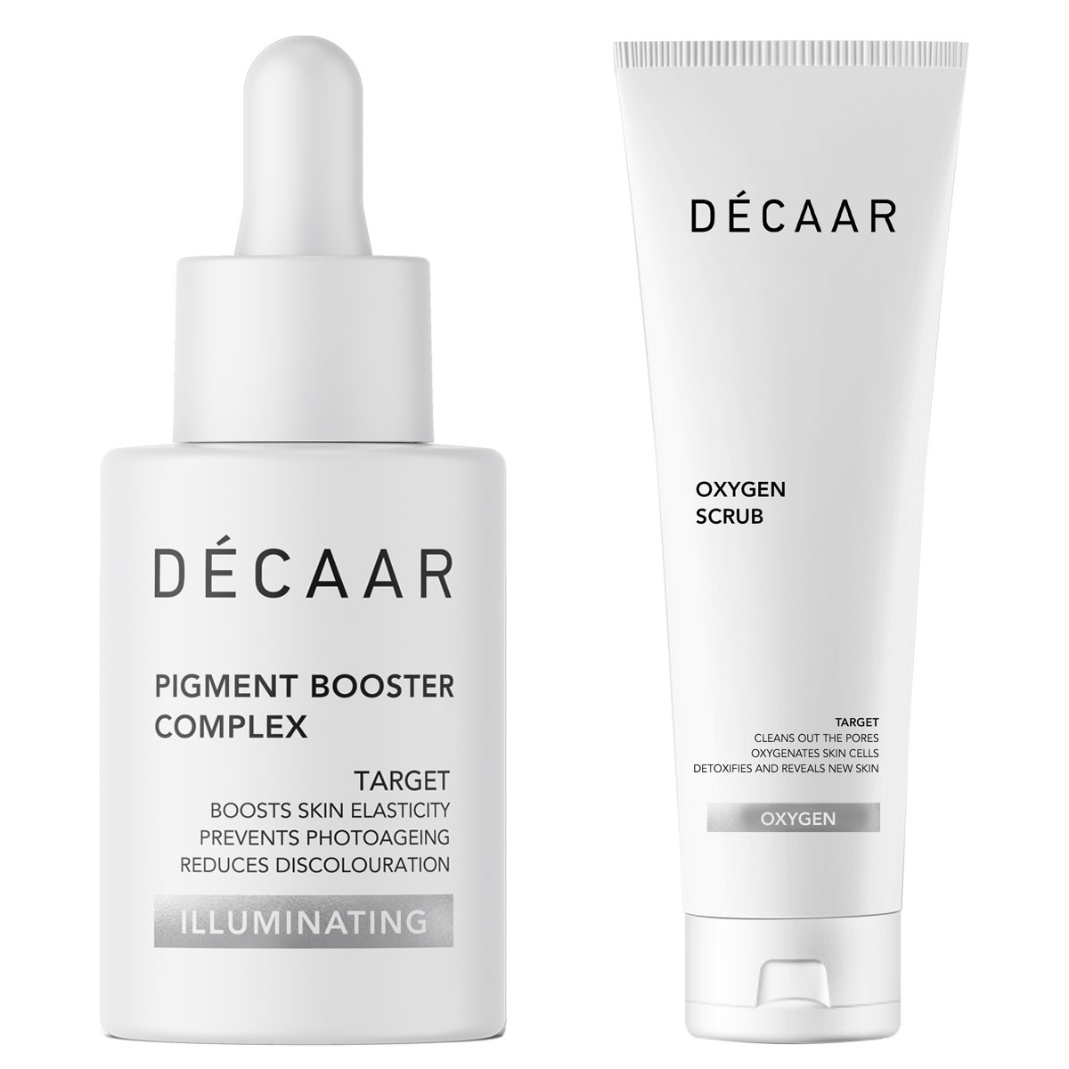 Ervaar de kracht van een stralende, egale huid met de combinatie van de Décaar Oxygen Scrub en het Illuminating Pigment Booster Complex.